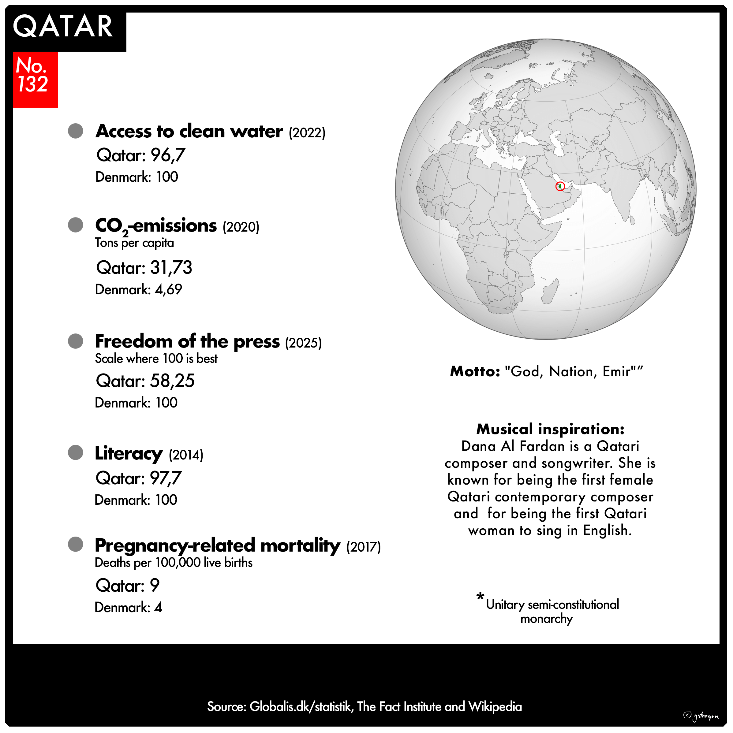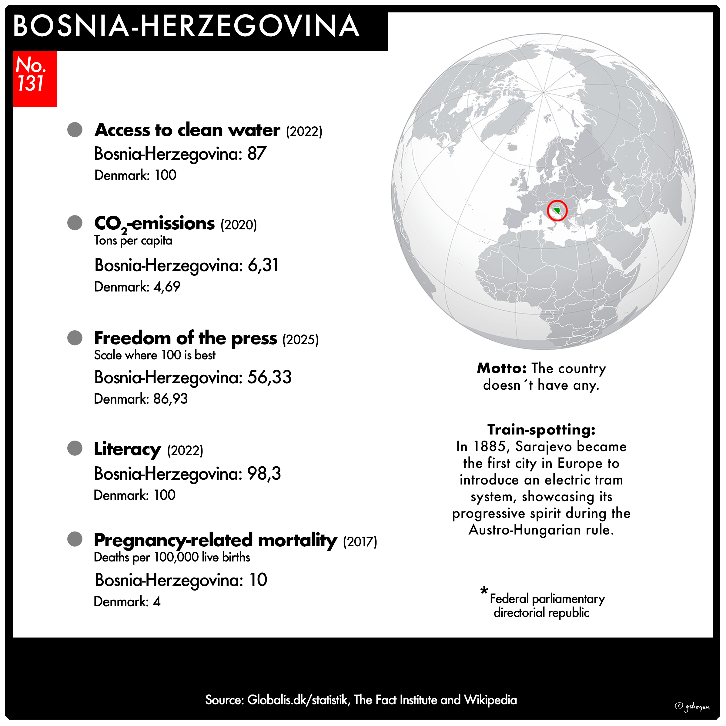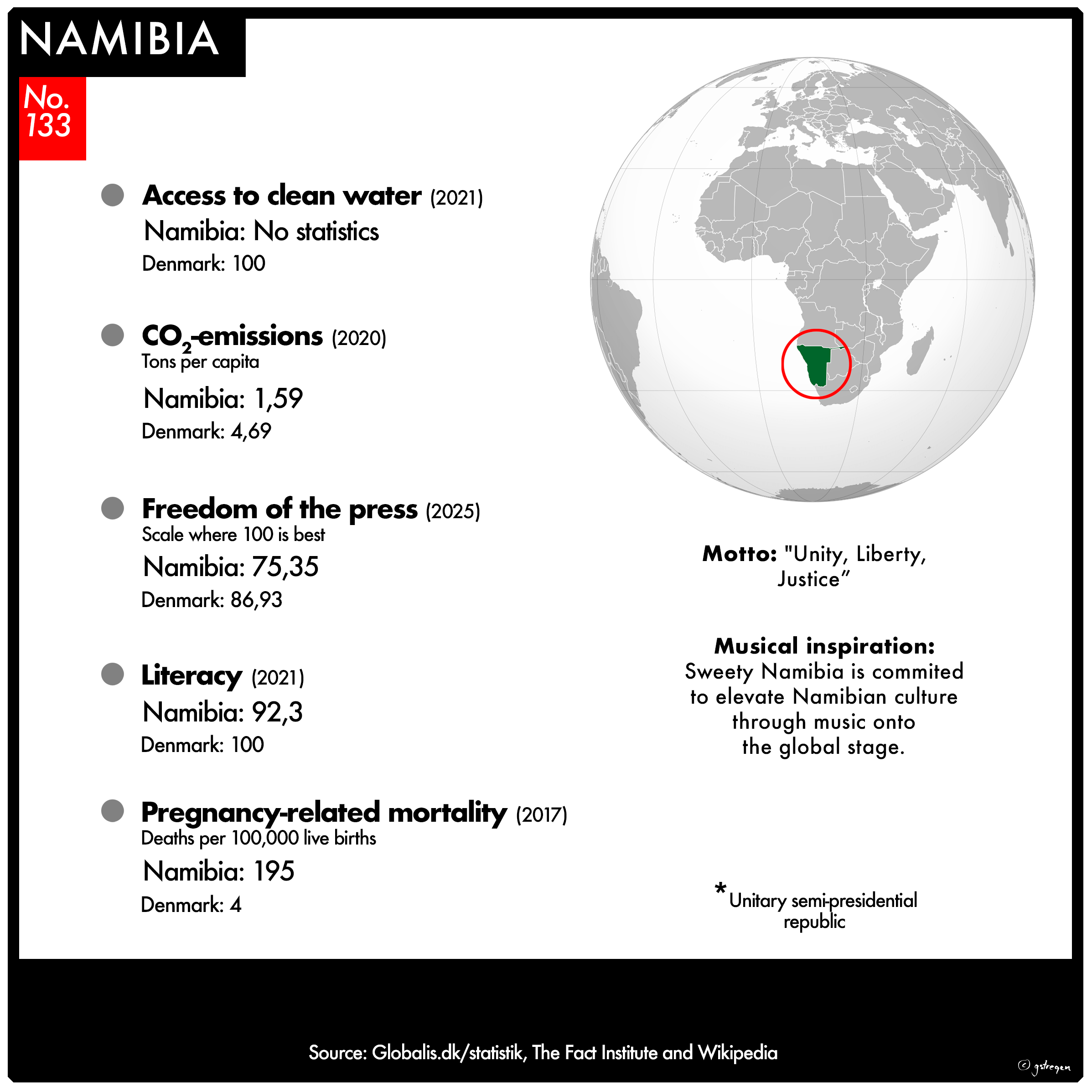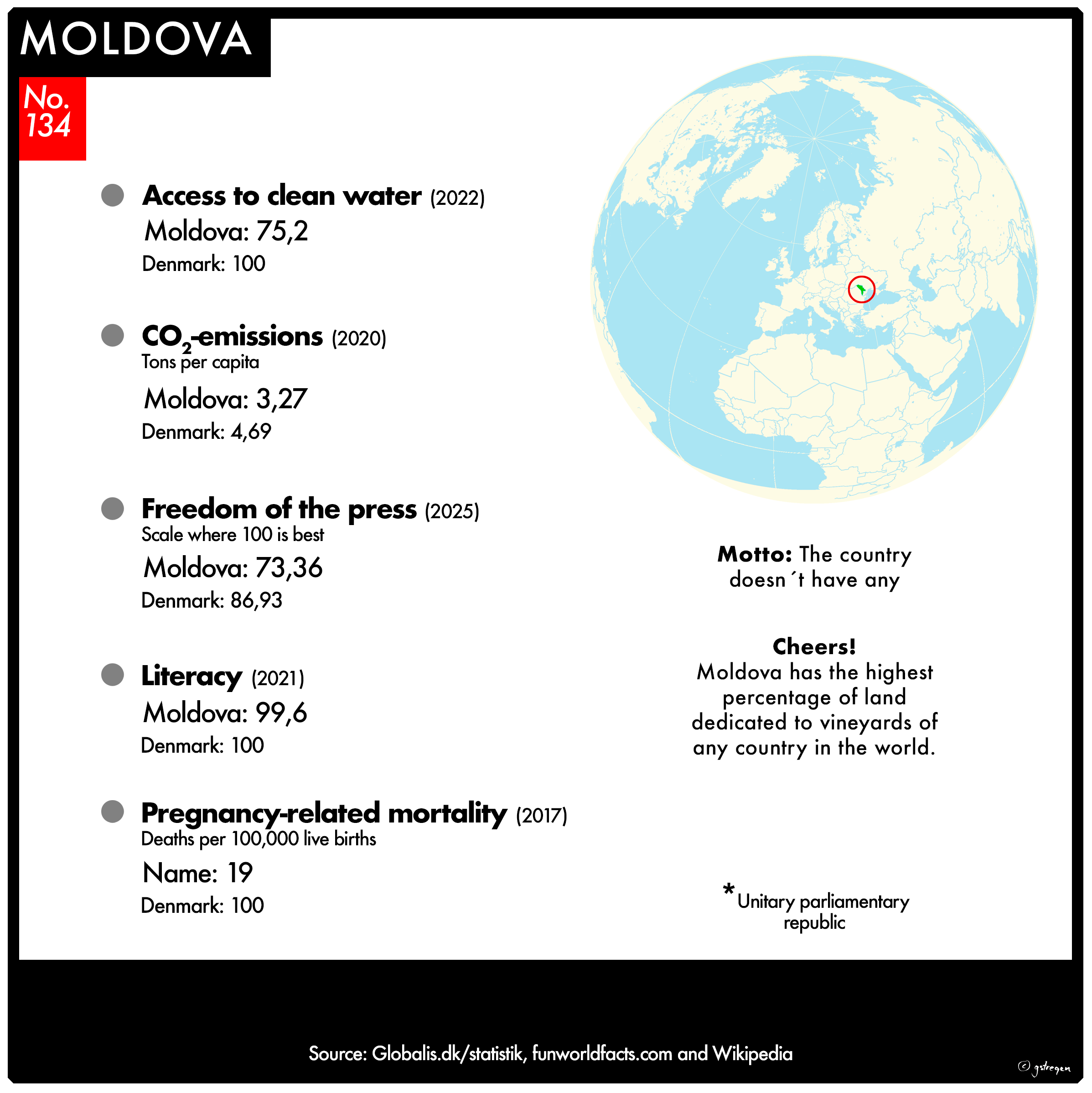 I have selected seven of them for this project: Form of government / Population / Access to clean water / Freedom of the press / Literacy rate / Pregnancy-related mortality / CO2 emissions – tons per capita.
