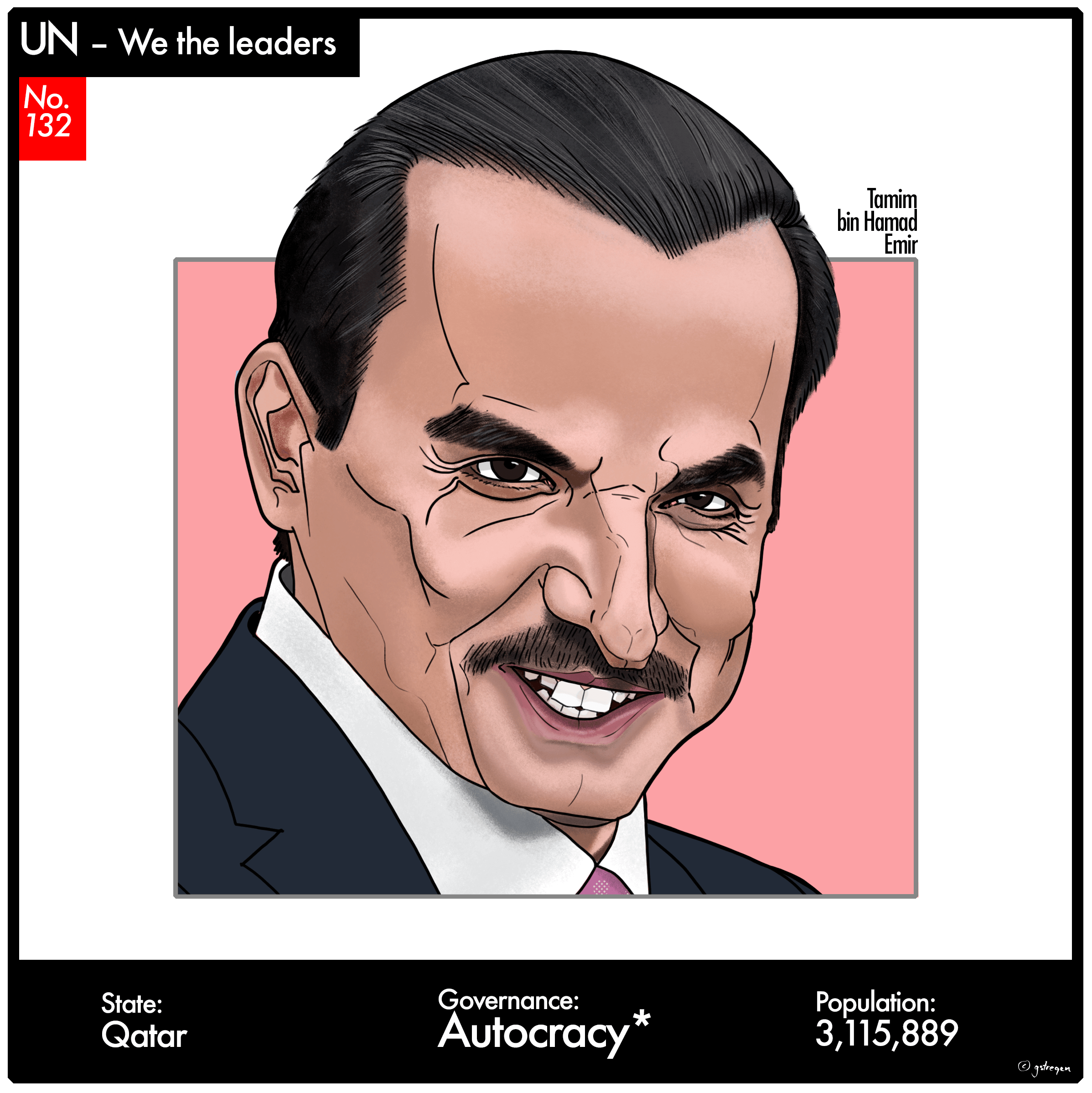 The colors behind the heads of state will change according to the countries’ overall form of government. Green = Democracy, Orange = Republic, Pink = Autocracy, Grey = Theocracy, Non-members = White